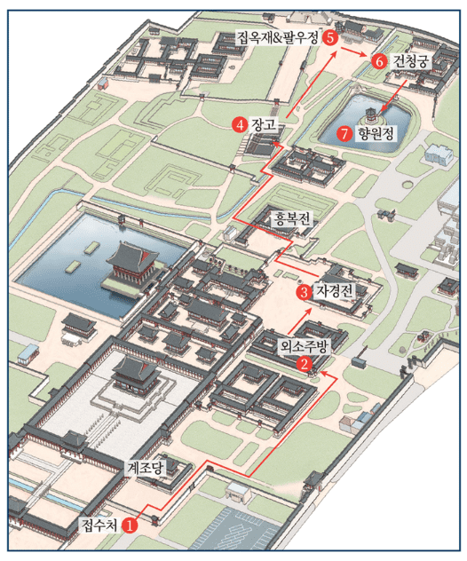 소주방→자경전→장고→집옥재→팔우정→건청궁→향원정