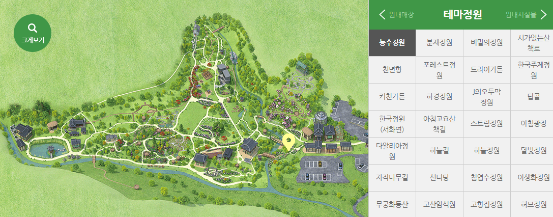 아침고요수목원에는 다양한 테마정원, 시설물 및 매장이 있습니다.